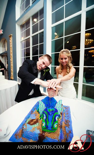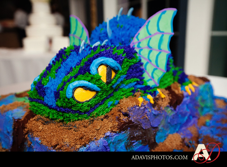 Rachel & Mark celebrated their wedding day with their reception at Reflections on Spring Creek in Plano. It was a great party! Rachel & Mark had fun 90s dance music playing that kept all of their friends on the dance floor all night. I loved that their first dance was to “I Have and I Always Will” by one of my favorite artists, Dave Barnes. (He is seriously amazing and you should totally check out his work.) I also totally loved that Mark had an amazing Dragon groomscake. 🙂 I hope you all enjoy viewing their reception photos.