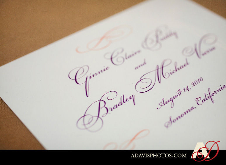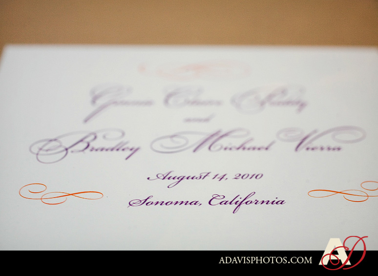 Welcome to a very long-awaited blog post! Ginnie & Brad were married in August at the Jacuzzi Family Winery in Sonoma Valley, California! It was my first destination wedding to photograph and I loved every moment of it! I have been holding on to their blog post until I had the right amount of time to dedicate to it. Ginnie planned such an amazing wedding with so many beautiful details. She chose a variety of wedding colors and integrated purple, orange, green and yellow throughout her wedding decor. The Jacuzzi Family Winery was a beautiful setting for their summer winery wedding and the architecture and winery was beautiful. Part 1 of their blog post features all of their amazing details; Part 2 will feature their wedding ceremony and reception at the Jacuzzi Winery.