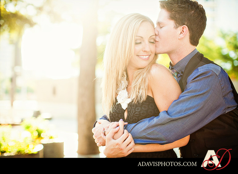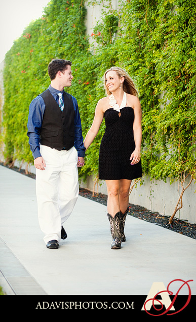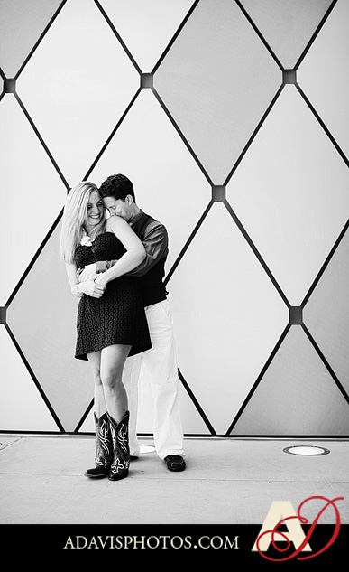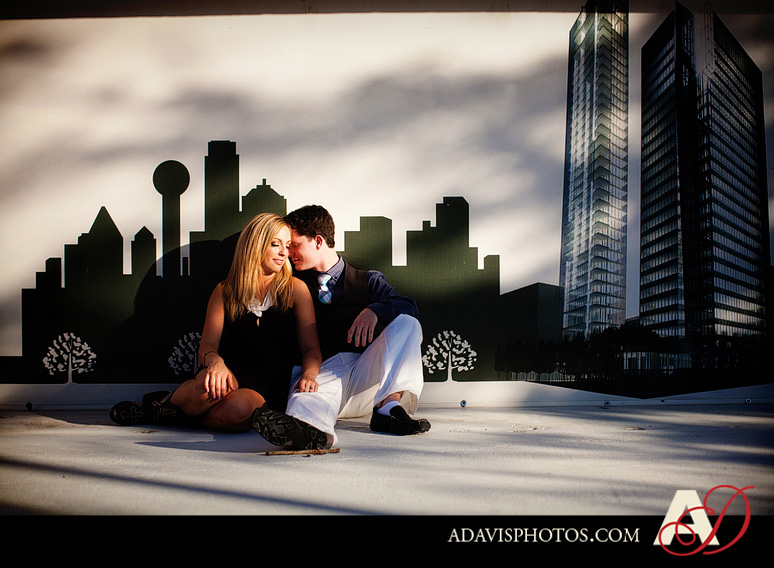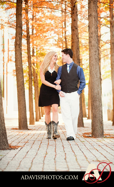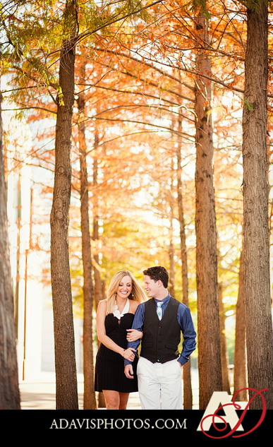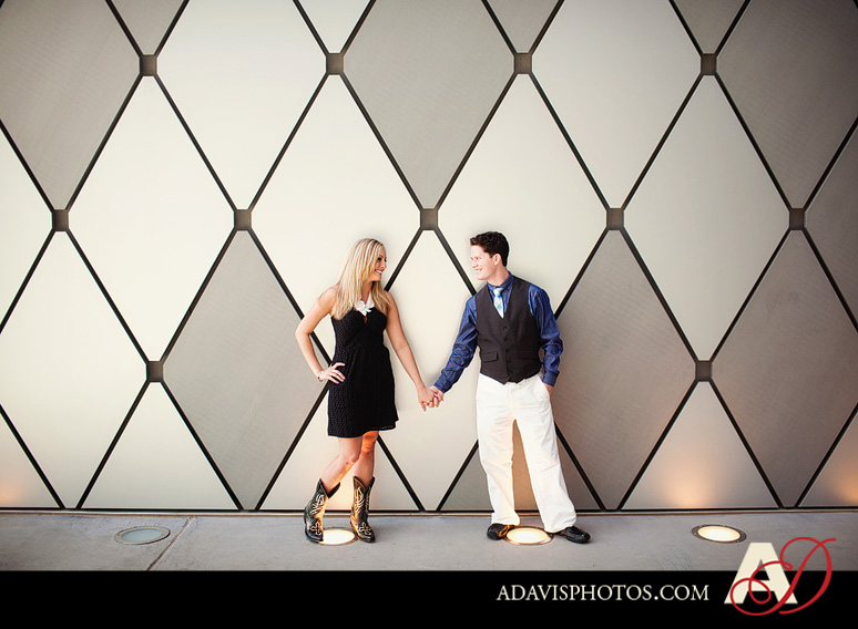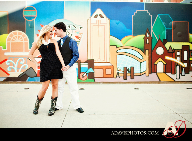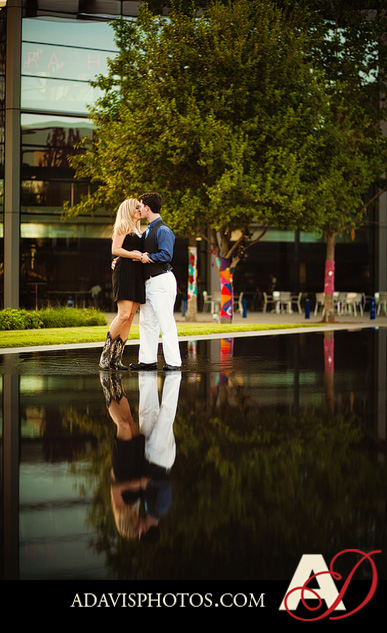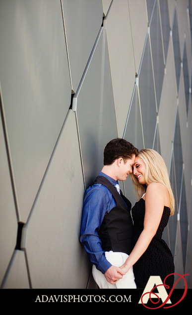 Meet Alyssa & Tyler! They’re getting married in January at The Height’s Baptist Church, followed by a wedding reception at the Hickory Street Annex, a cool urban loft wedding venue in downtown Dallas. Alyssa & Tyler have so much sweet natural chemistry and they love to have fun and laugh together. We had an amazing time photographing their engagement portraits in the Dallas Arts District (near The Winspear & The Meyerson) and along an area of Turtle Creek Park. Tyler is an artist and Alyssa is an actress, so the fun and colorful engagement locations really brought out their personalities and spurred on our creativity. I hope you enjoy viewing their engagement portraits! 🙂