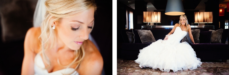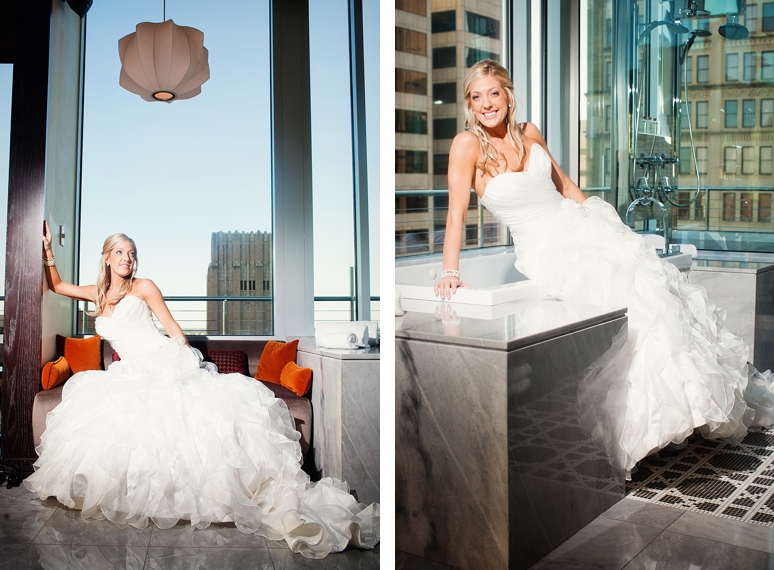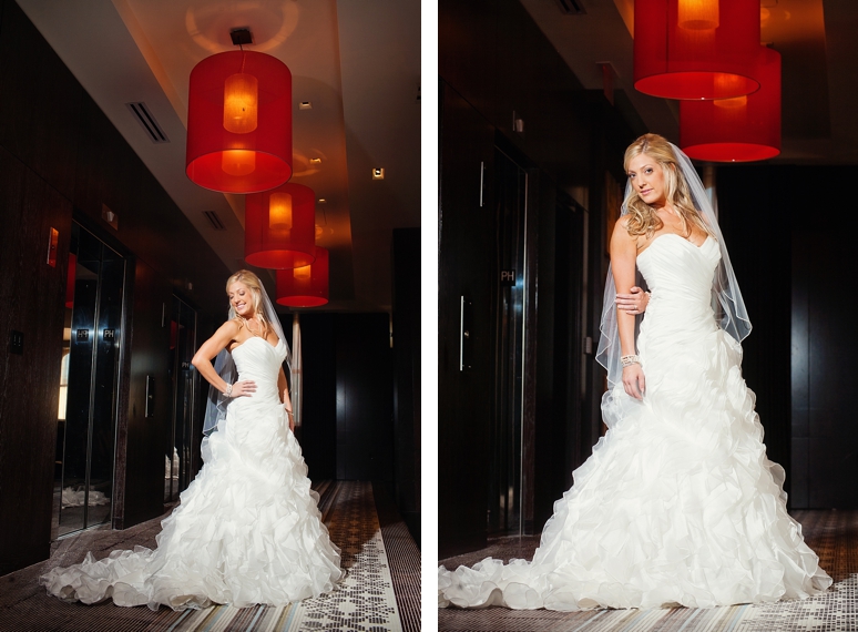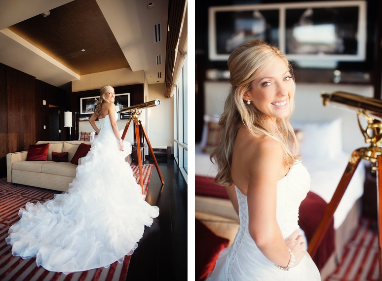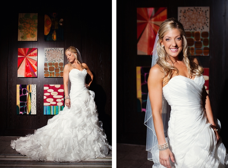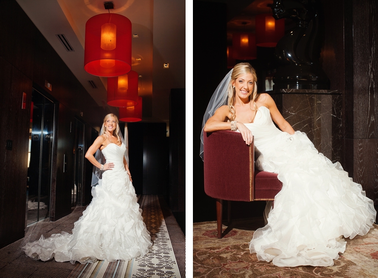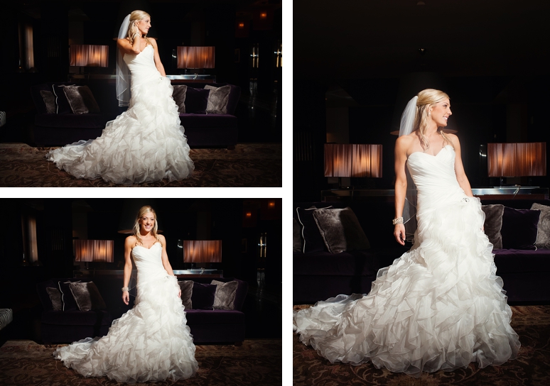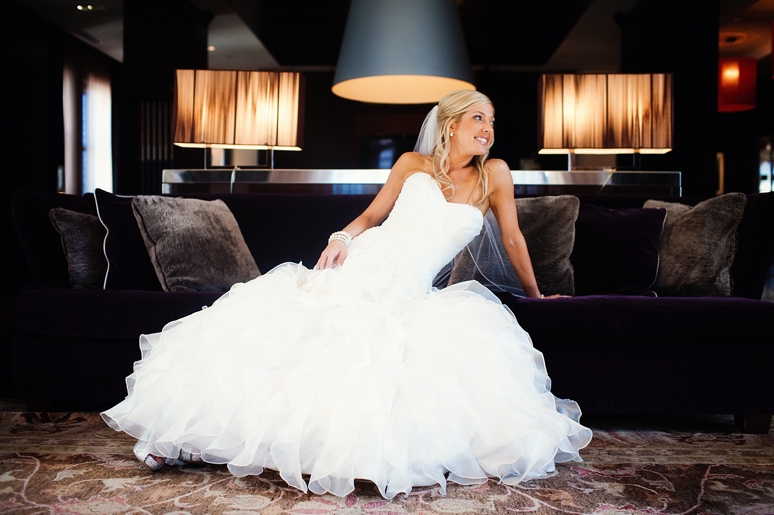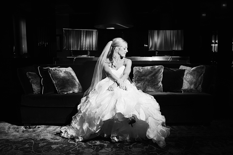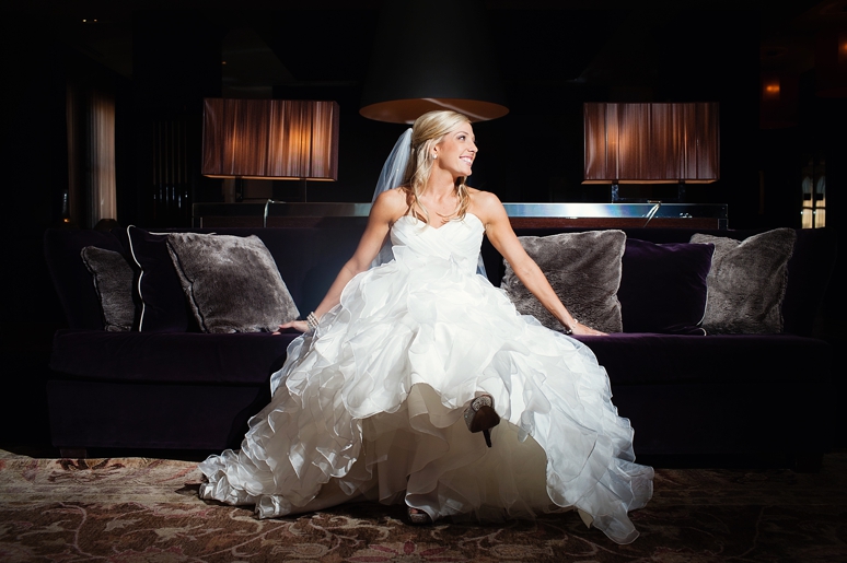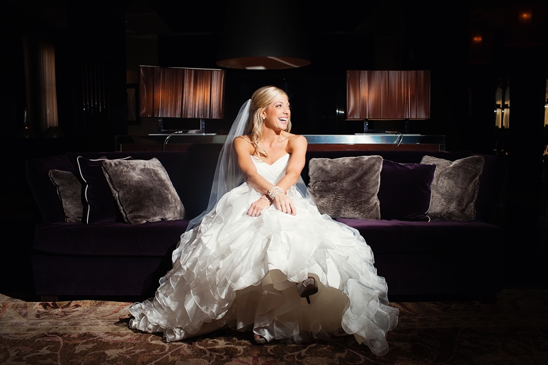 Rachelle & Keith were married Friday at the Dallas Arboretum followed by their wedding reception at the fabulous Joule Hotel on Main Street in Downtown Dallas. We photographed Rachelle’s bridal portraits in the modern and fabulous Joule Hotel Penthouse Suite. I loved Rachelle’s Maggie Sottero wedding dress with the flowing ruffles and beautifully fit sweetheart neckline. Rachelle even blinged out her own wedding shoes with swarovski crystals. The Joule’s Penthouse suite is amazing with plush purple couches, beautiful artwork and so much more.