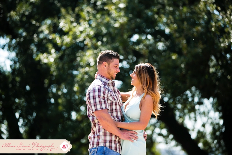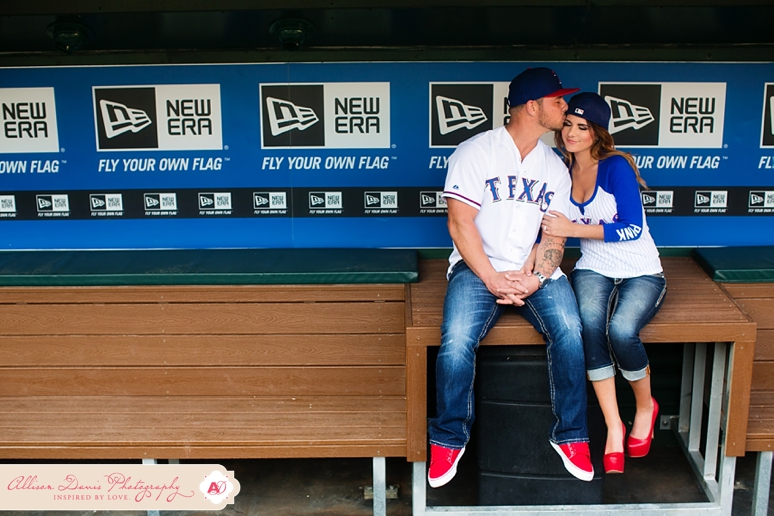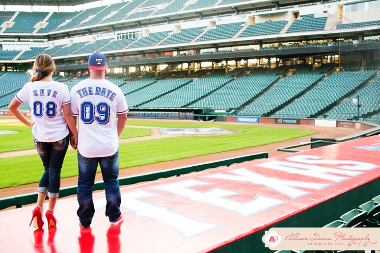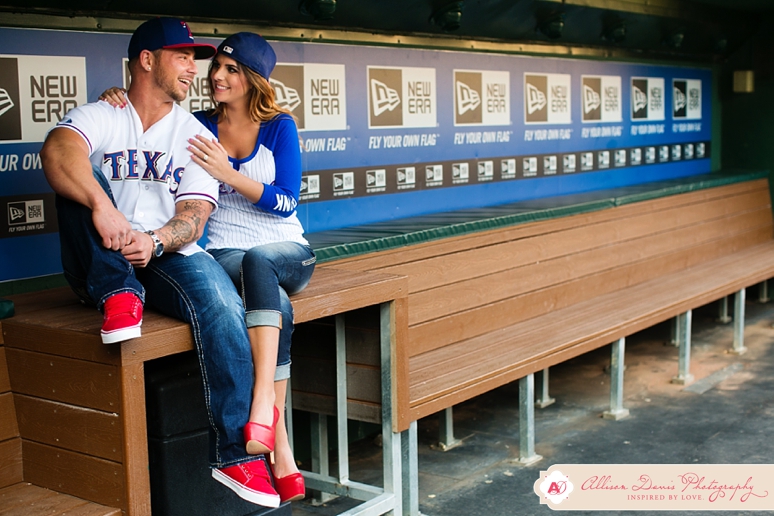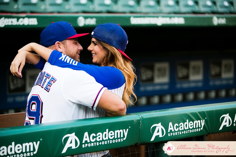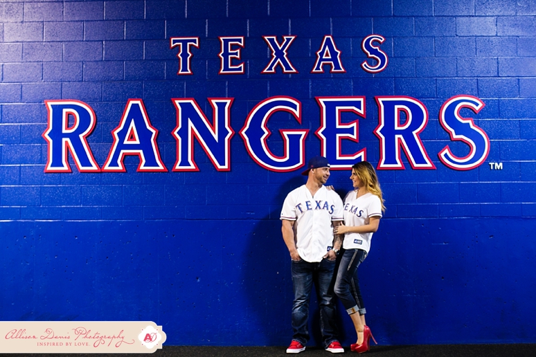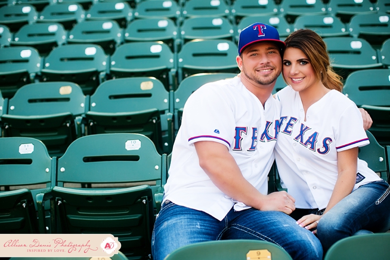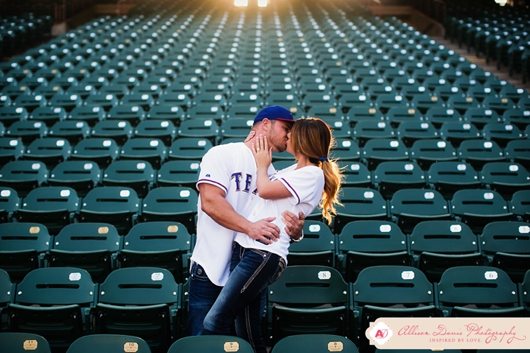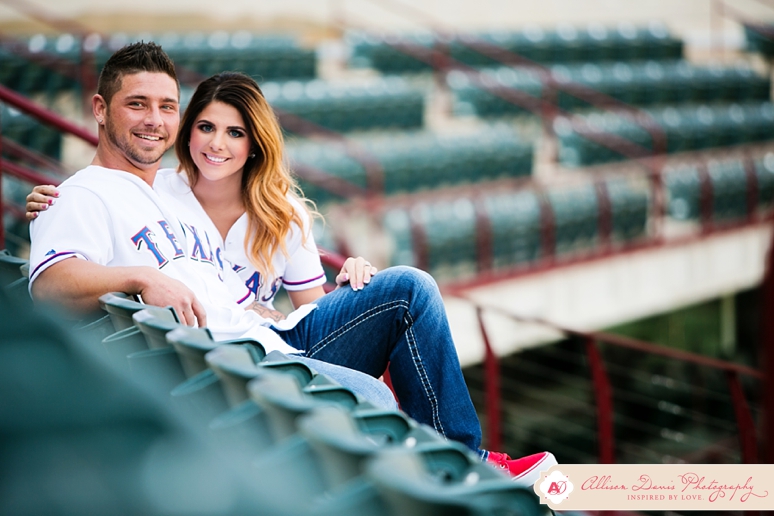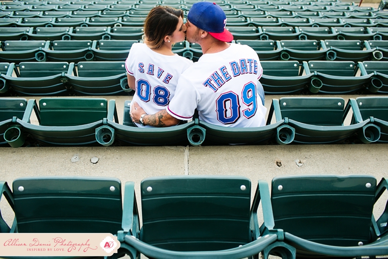 It’s opening day for Texas Rangers baseball and I couldn’t have picked a more perfect day to share Lauren & Zach’s engagement portraits! They’re Texas Rangers fans and so they really wanted to do some of their engagement portraits at the Ballpark in Arlington, complete with their super-cute Save the Date Jersey’s. These were really fun baseball themed engagement portraits. This first picture is seriously one of my all-time favorite engagement portraits — I found that sweet pocket of sunlight coming in and oh man, I’m in love! They’re a sweet, fun-loving couple getting married in in August. I hope you enjoy their Dallas engagement pictures.