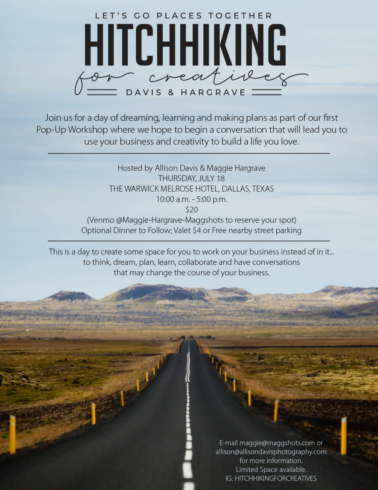 Our first popup workshop is Thursday, July 18 at the Warwick Melrose Hotel in downtown Dallas. Maggie & I are ready to share lessons we’ve learned in the years of being entrepreneurs and creatives. We hope you’ll come alongside us in this journey. The flyer below shares most of the details for this first experiential workshop. E-mail me at allison@allisondavisphotography.com with any questions and we hope to see you there.